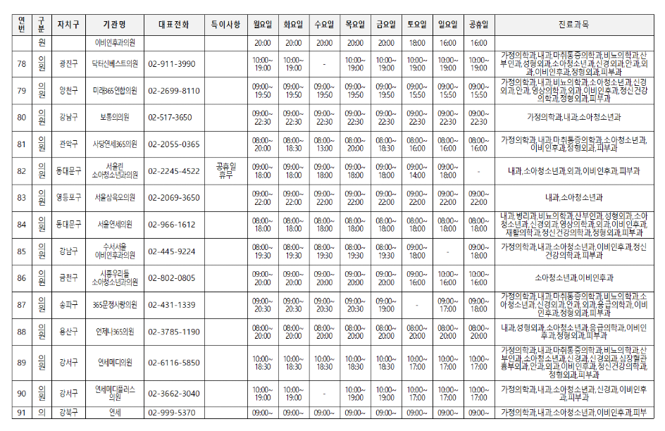 서울시는 시민들이 응급 상황뿐만 아니라, 야간이나 휴일에도 적절한 진료를 받을 수 있도록 105개소의 야간·휴일 진료 병의원 정보를 제공하고 있습니다.