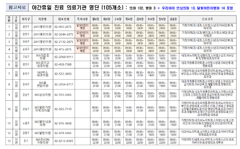 105개소의 야간·휴일 진료 병의원 명단 첨부자료