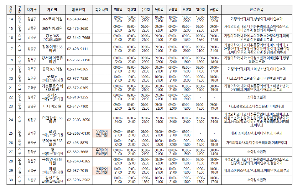 서울시에서는 야간 및 휴일에도 진료 가능한 병의원 정보를 제공합니다.