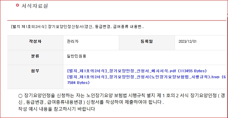 ✅ 장기요양인정 신청서 (국민건강보험공단 지사 또는 홈페이지에서 다운로드 가능)