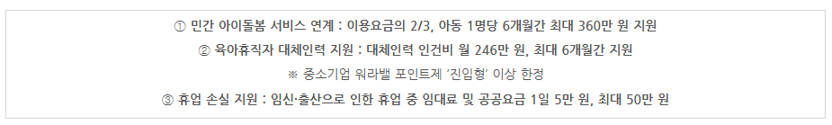 ③ 출산휴가 급여 보전: 마지막 한 달 급여 최대 90만 원 지원.