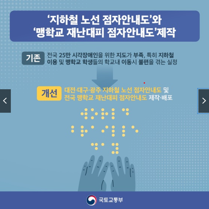 • 개선 내용: 대전·대구·광주 지하철 노선 점자안내도와 전국 맹학교 재난대피 점자안내도 제작·배포.