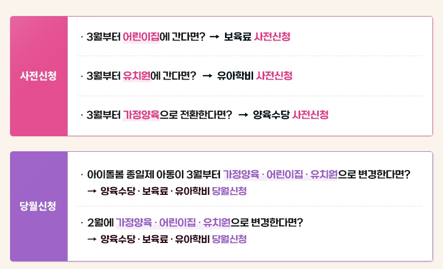 | 양육수당 → 보육료, 유아학비 | 15일까지 신청: 신청일부터 적용(2월 양육수당 지원 불가) 16일 이후 신청: 2월 양육수당 지급, 3월부터 보육료·유아학비 지원 |