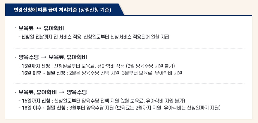 | 보육료 ↔ 유아학비 | 신청일 전날까지 기존 서비스 적용, 신청일부터 변경 서비스 적용 |