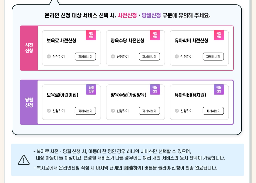 - 가정양육 전환 예정 → 양육수당 사전신청