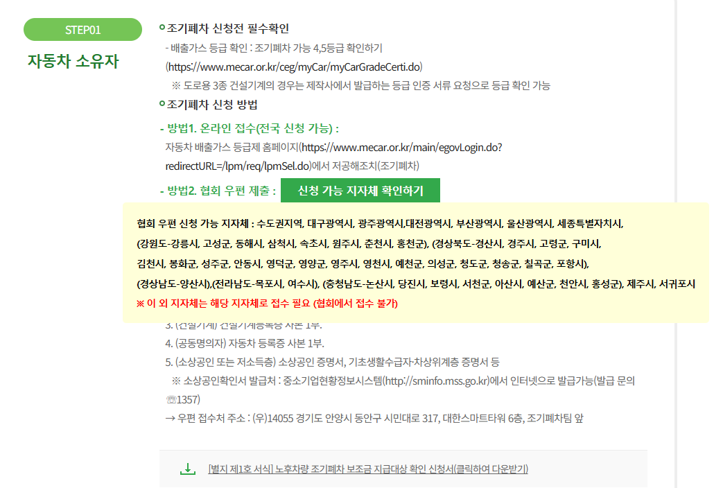 신청 방법은 한국자동차환경협회 홈페이지 또는 관허 폐차장을 통한 대행 접수가 가능합니다.