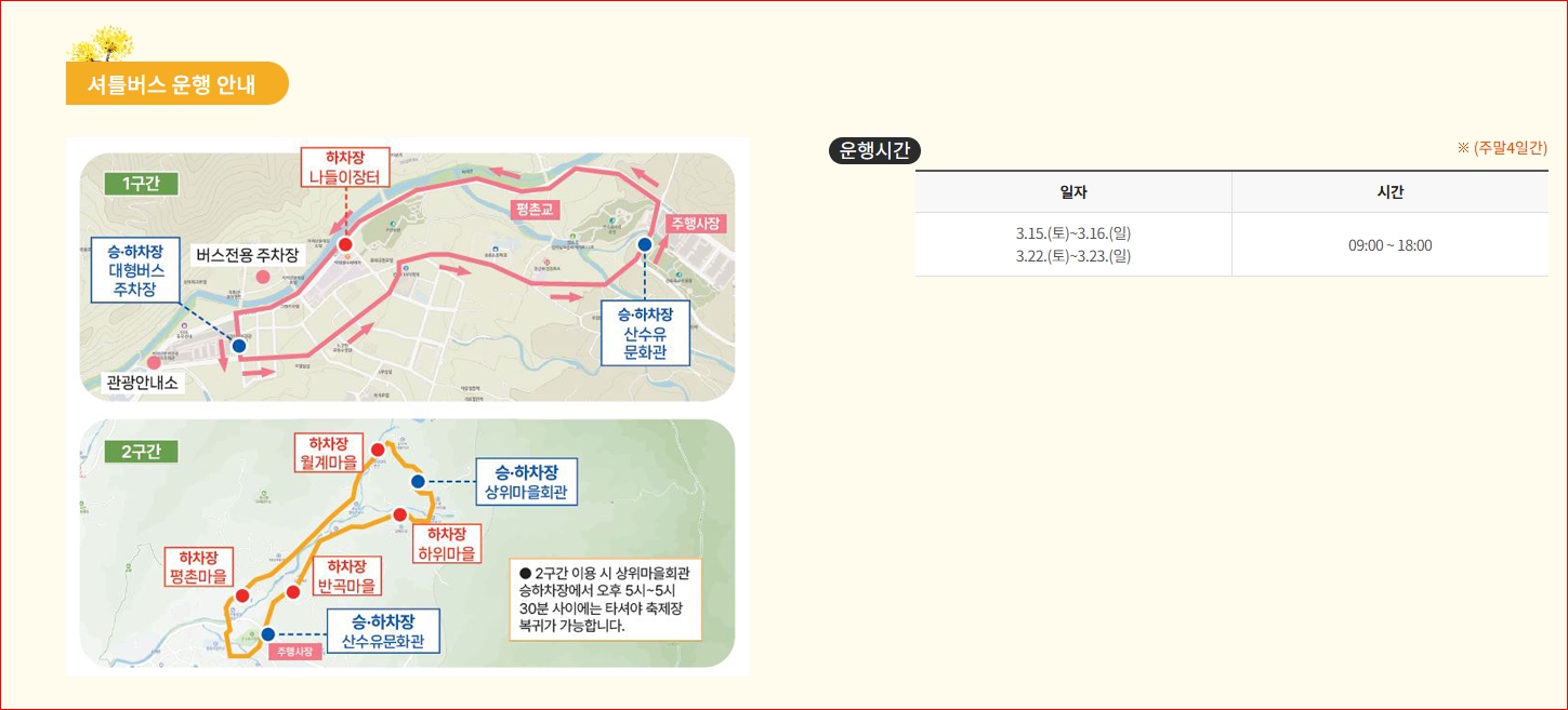 | 셔틀버스 운행 | 주말 (3월 15~16일, 3월 22~23일) 09:00~18:00 |