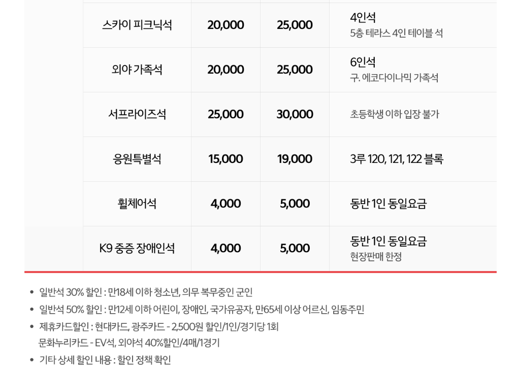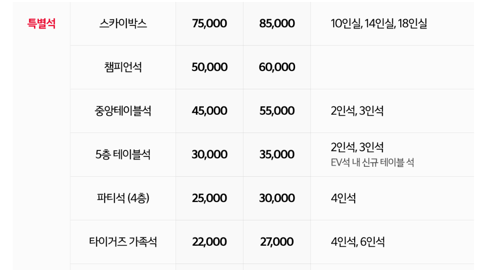 - 응원 특별석은 시즌권 및 선예매로 구매할 수 없으며, 일반 예매에서만 구매 가능합니다.