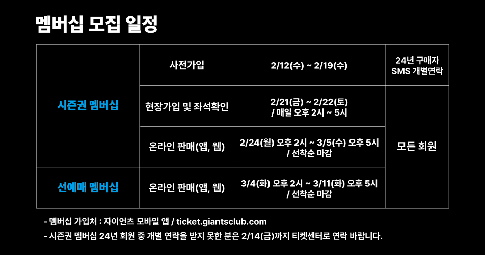 시즌권 멤버십과 선예매 멤버십의 가입 일정이 다르므로, 희망하는 멤버십의 신청 기간을 꼭 확인하세요.