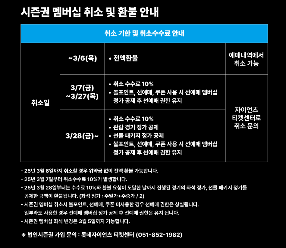| 3월 28일(금)~ | 취소 수수료 10% + 경기 좌석 정가 공제 후 환불 |