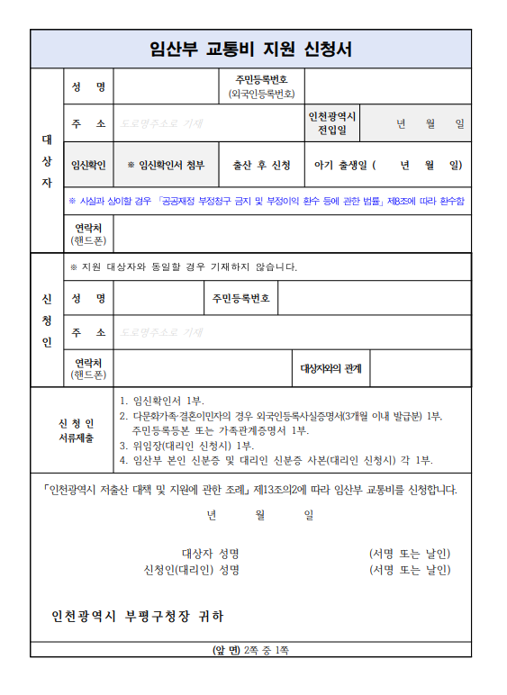 - 신청일 기준, 인천시에 6개월(180일) 이상 주민등록을 두고 실거주하는 임산부