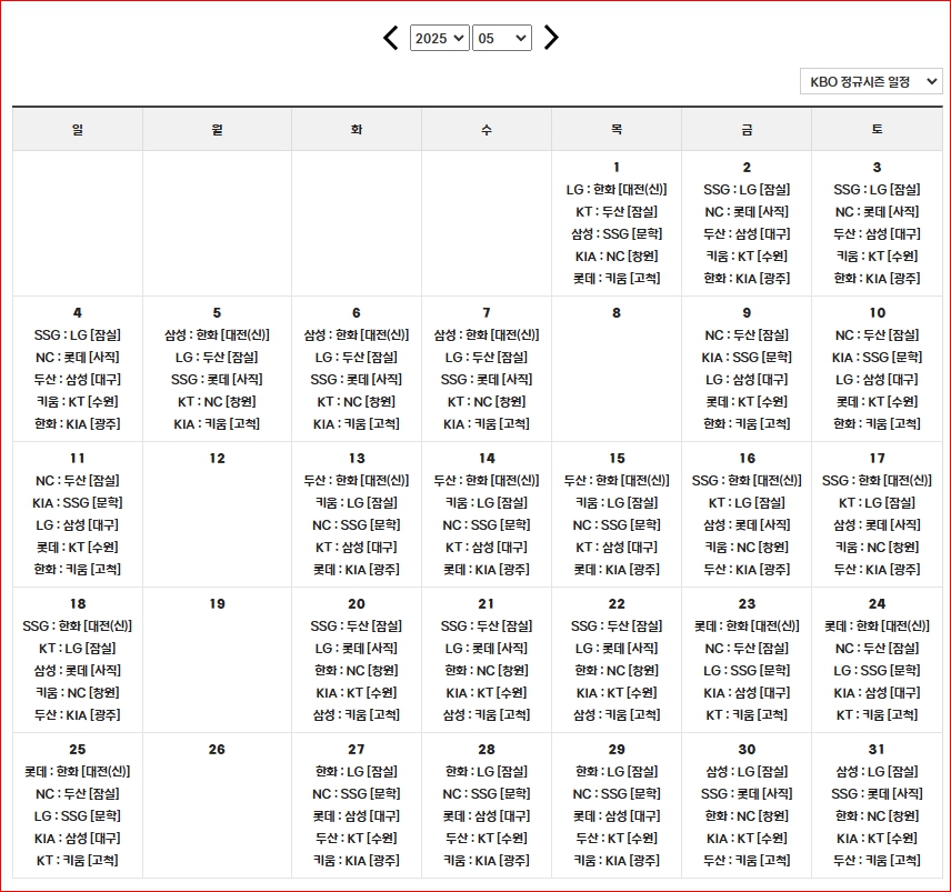 ⚠ 5월 8일(목) 은 모든 팀이 이동일로 지정되었습니다.