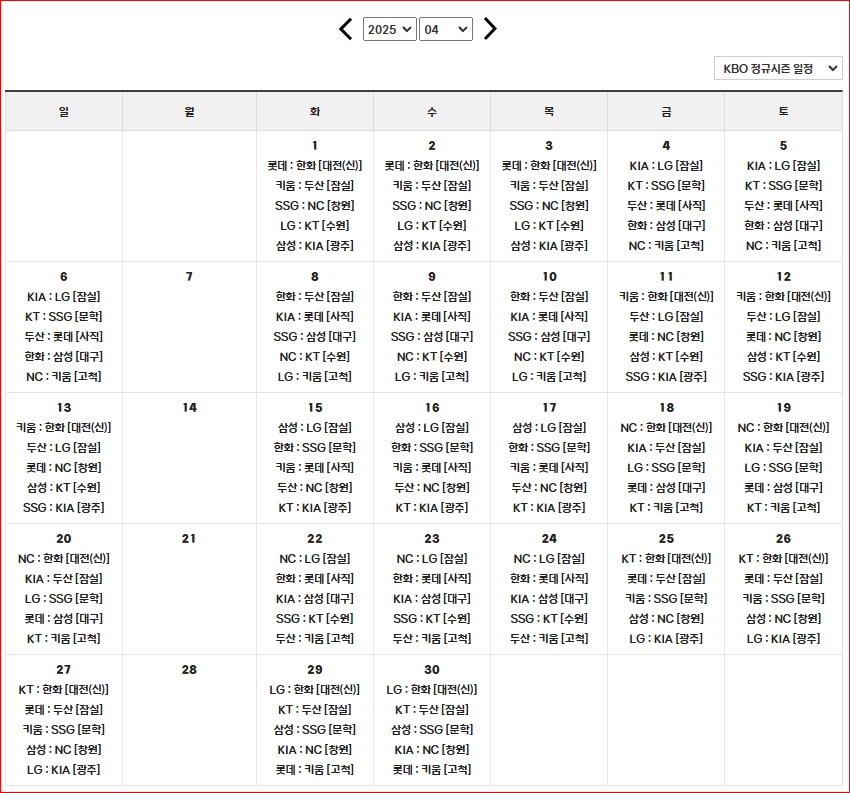- 미편성된 45경기(팀당 9경기) 는 우천 취소 경기와 함께 추후 일정 조정