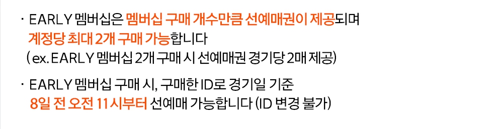📌 EARLY 멤버십 구매자는 경기 기준 8일 전 오전 11시부터 선예매 가능 (ID 변경 불가)