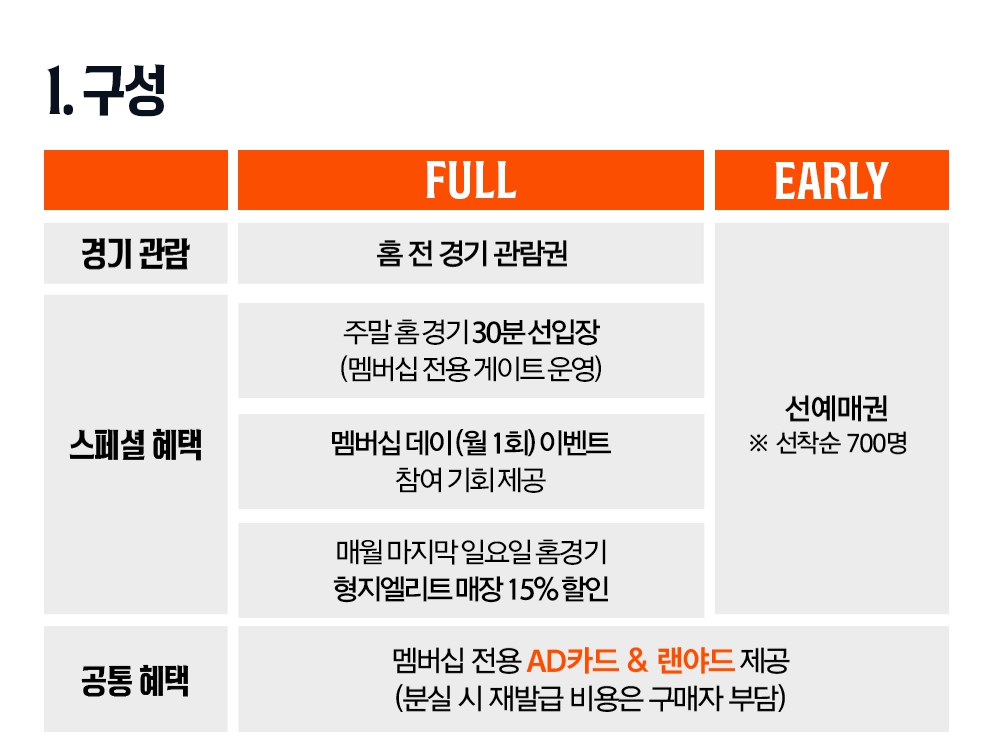 | 경기 관람 | 홈 전 경기 관람권 제공 | 선예매권 제공 (선착순 700명) |
