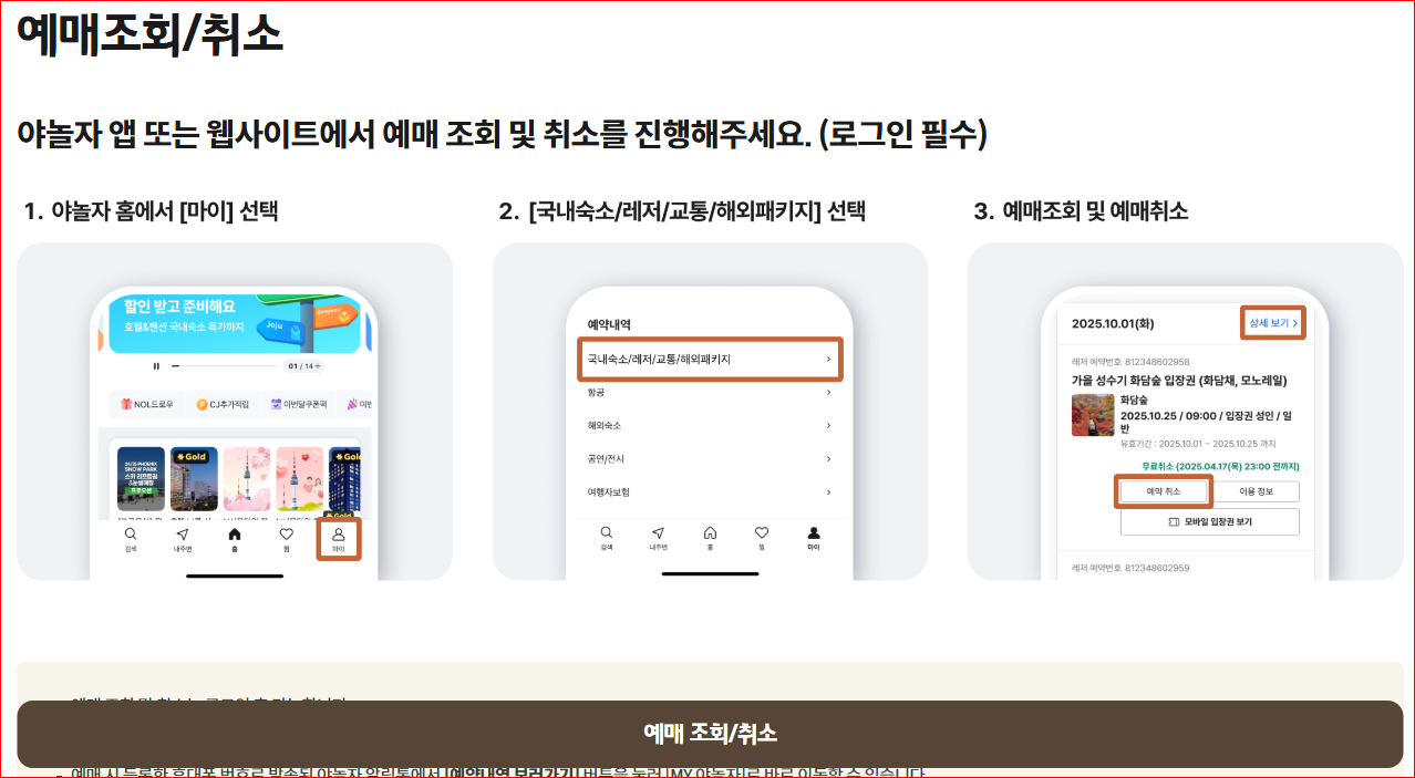 • 예매 완료 후 마이 야놀자 → 주문 내역에서 확인 가능