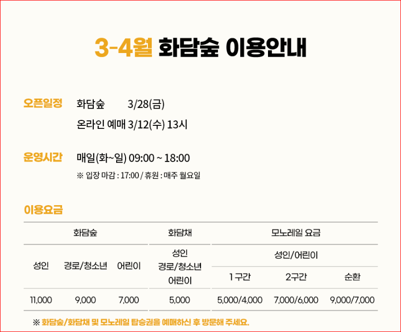 • 화담채(음식점 입장권), 모노레일 탑승권 별도 구매 가능