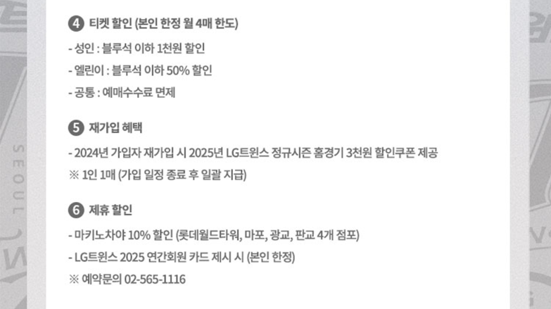 - 트윈스 굿즈 구매 할인 (상시 5% 할인, 회원의 날 50% 할인)