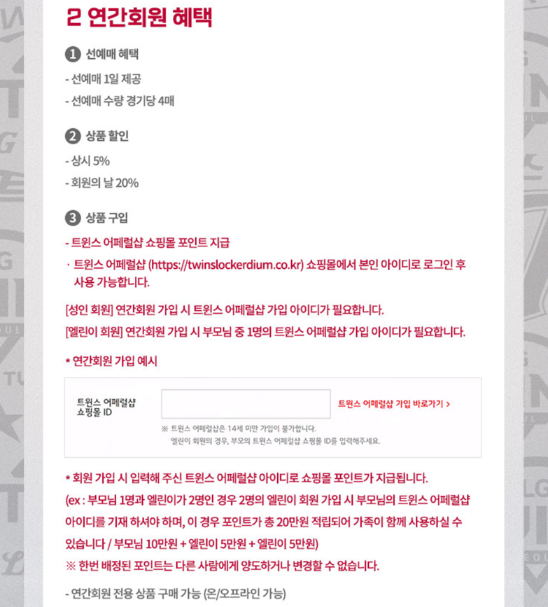 LG트윈스 연간회원은 엘린이(어린이) 회원과 성인 회원으로 나뉘며,